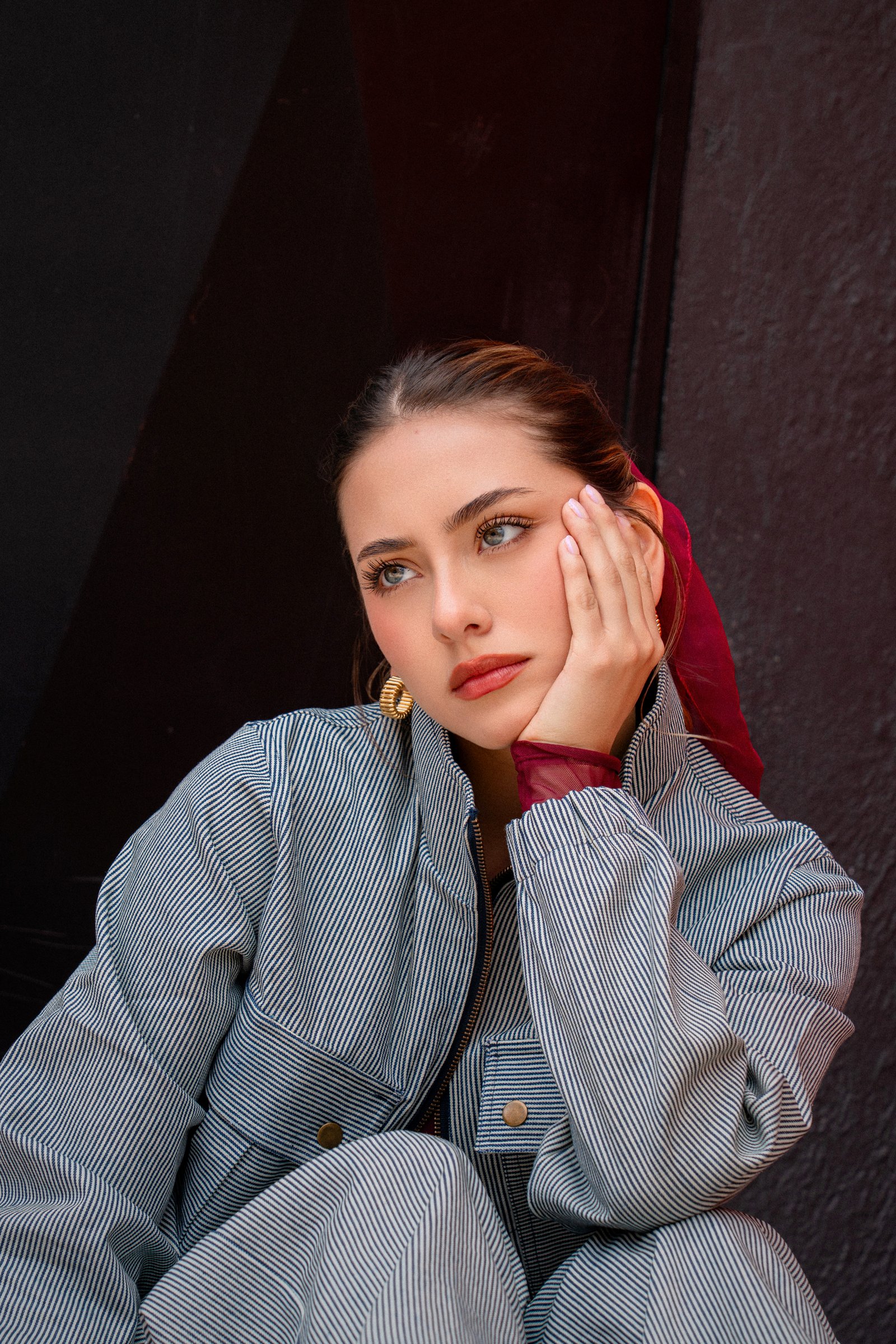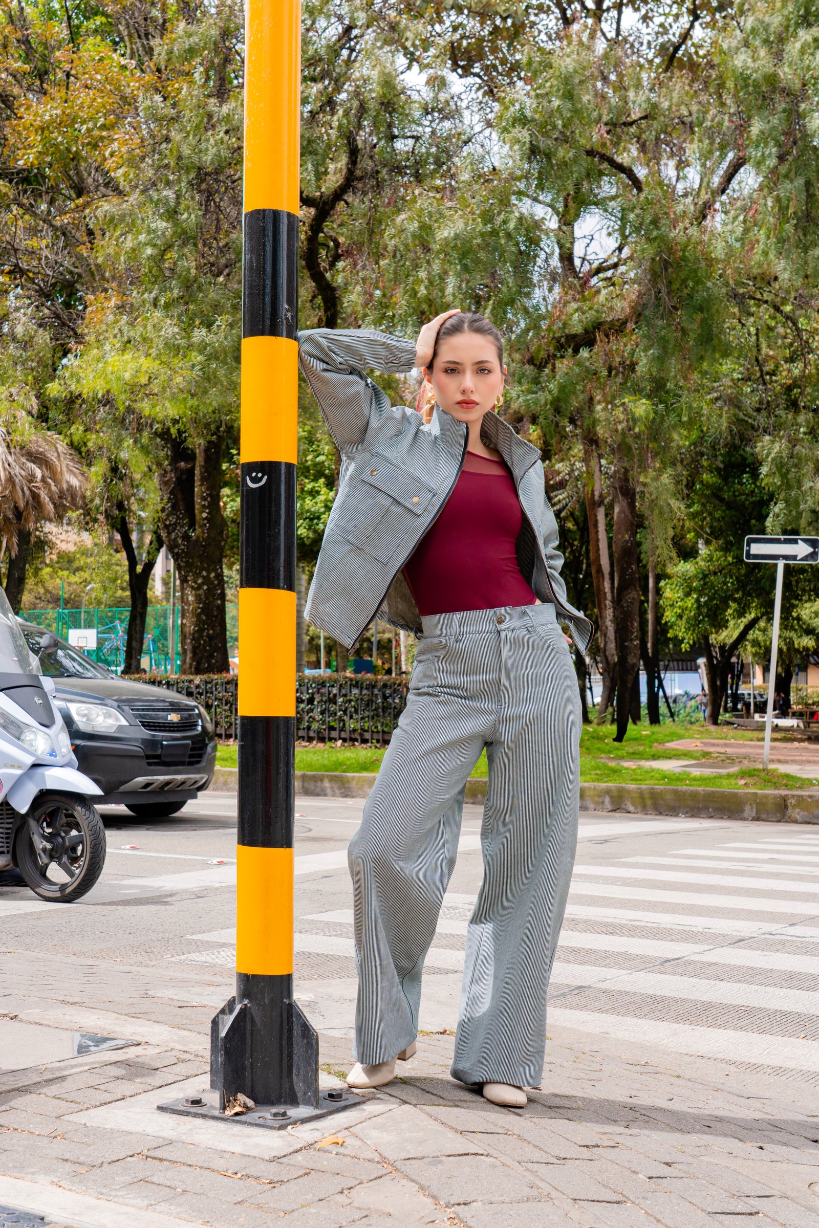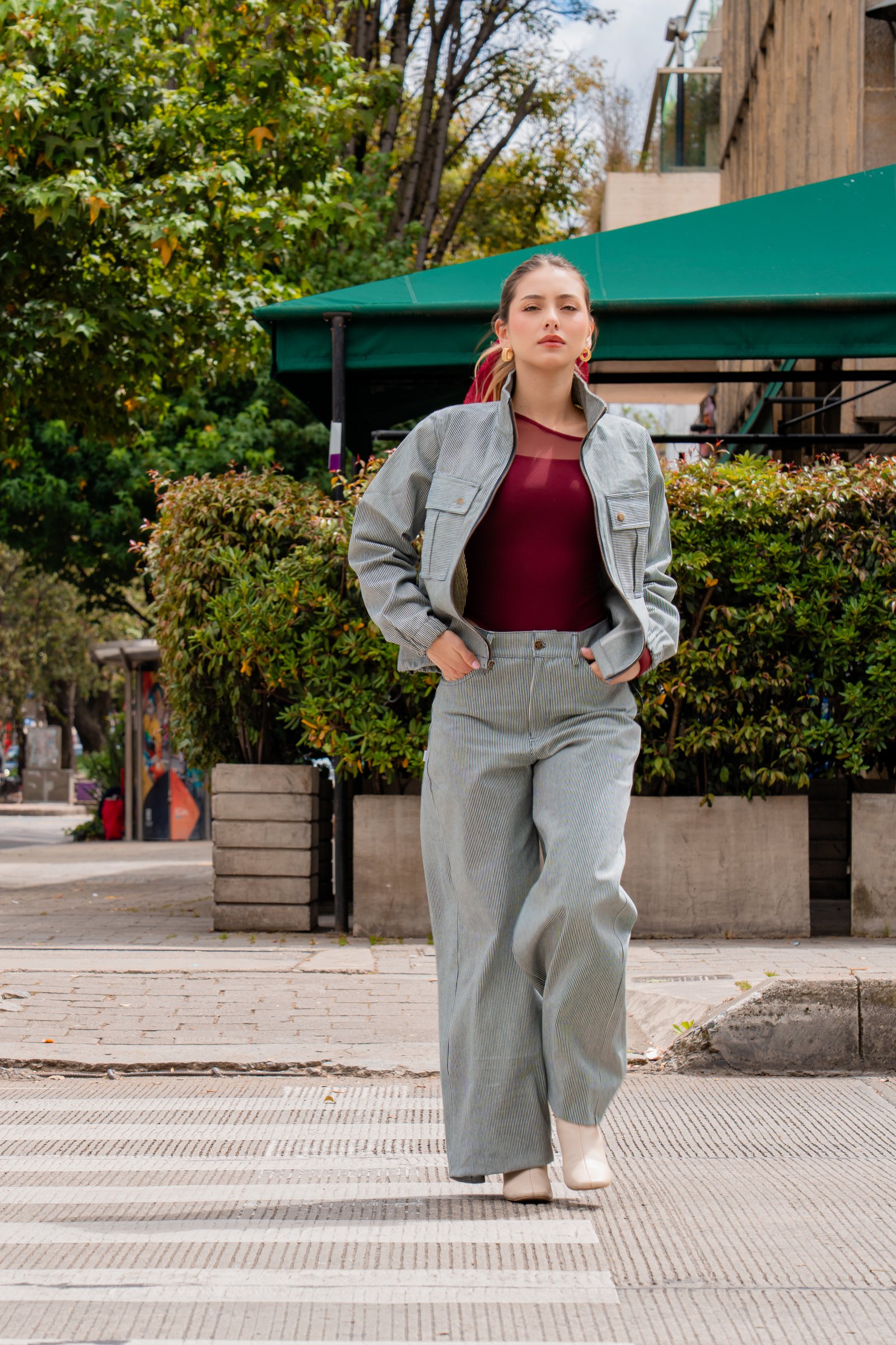 - LA MODELO ESTA USANDO UNA CHAQUETA TALLA M Y PANTALÓN TALLA S.